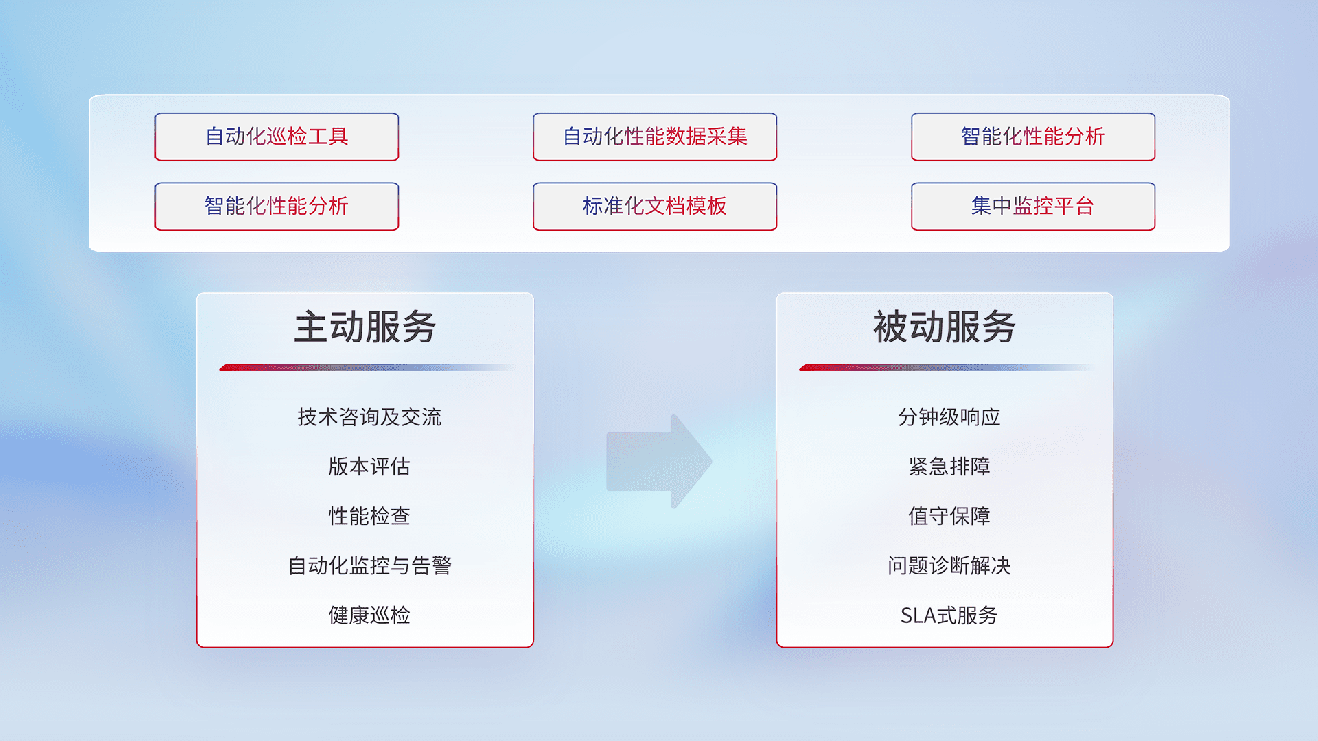 智能化工具和标准化文档,,,,保障服务质量,,,提供主动服务(包含技术咨询、、、版本评估、、、、性能检查、、、、自动化监控与告警、、健康巡检)和被动服务包含(分钟级响应、、、、紧急排障、、值守保障、、、问题诊断解决、、、SLA服务)。。。。